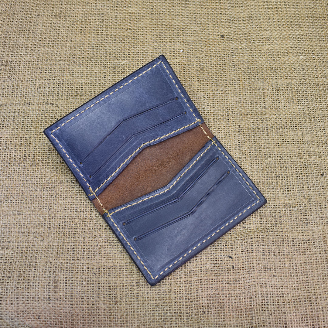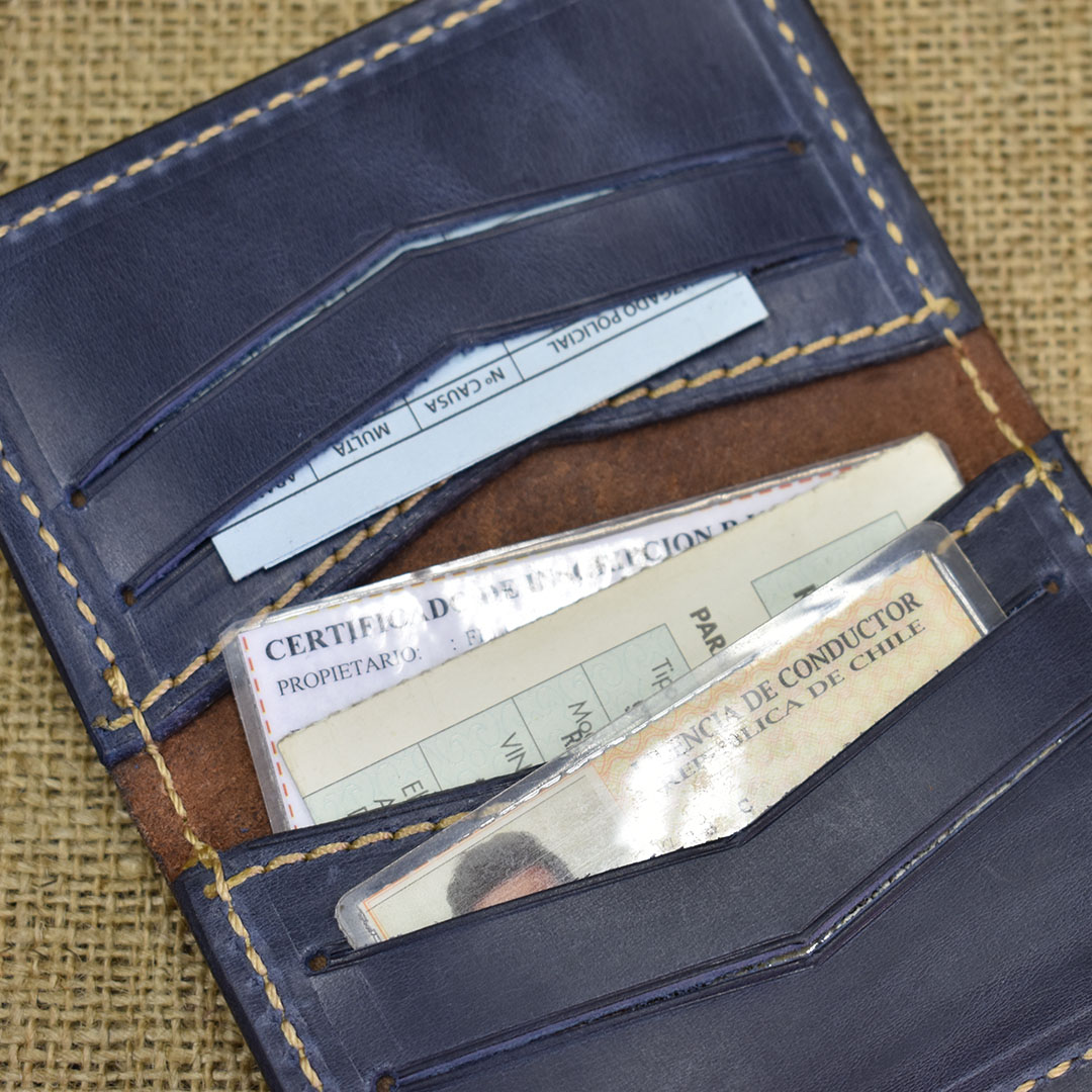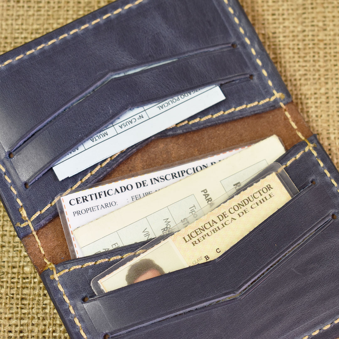Portadocumentos manufacturado en cuero graso moro y everest azul, con 6 espacios para poder organizar tarjetas, credenciales, papeles del vehículo entre otros.